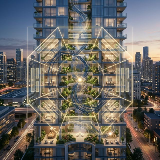 [IMAGE DESCRIPTION: A professional architectural visualization of a futuristic high-density residential tower in Toronto 2026. The image features a translucent golden "Bagua Grid" overlaid on the building's facade. Coiling blue and gold "Qi Flow" lines illustrate how energy is captured by sky gardens and distributed via the SMR core. The aesthetic is sleek, cinematic, and hyper-realistic, reflecting the high-authority 'Zen-Node' standard.]
